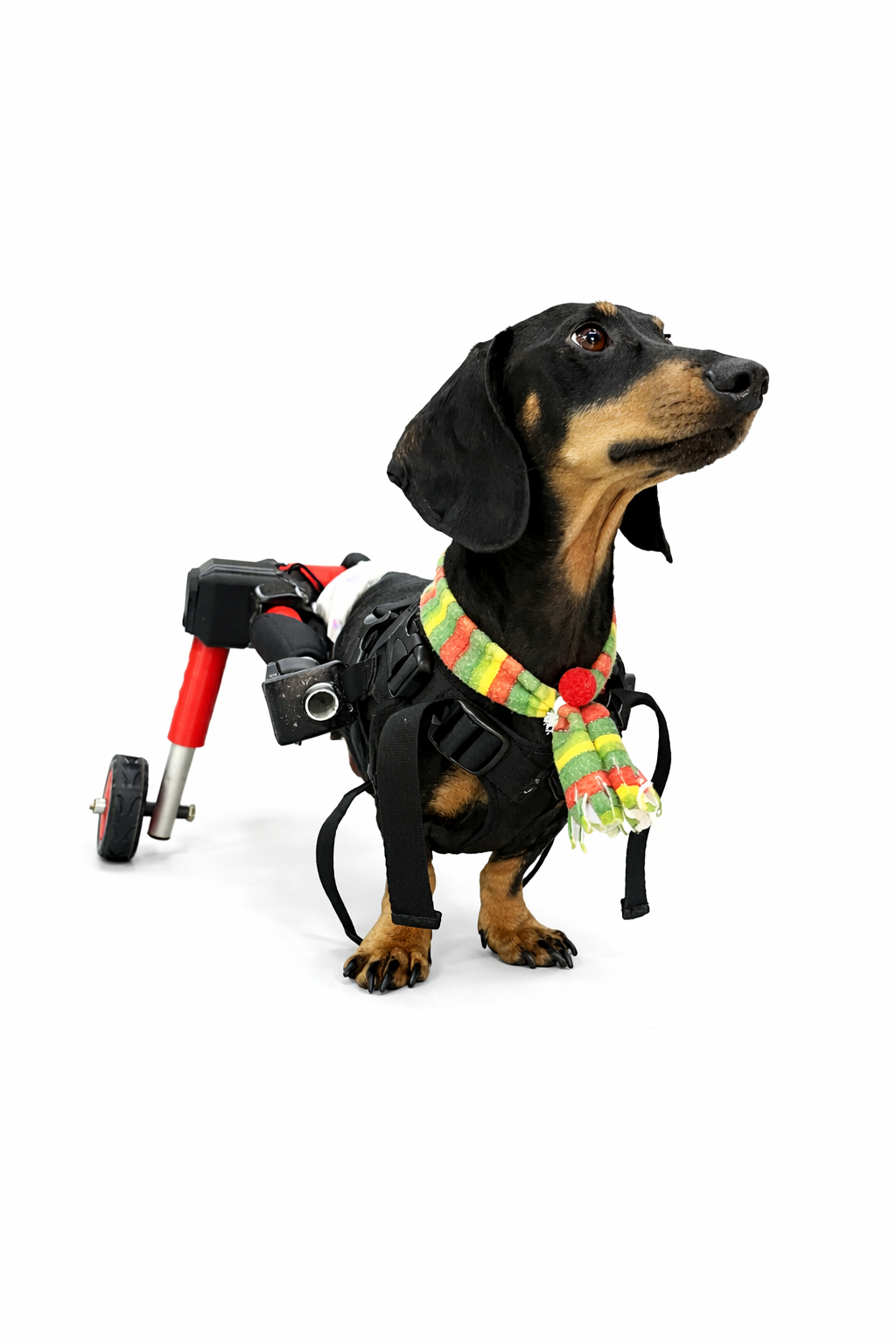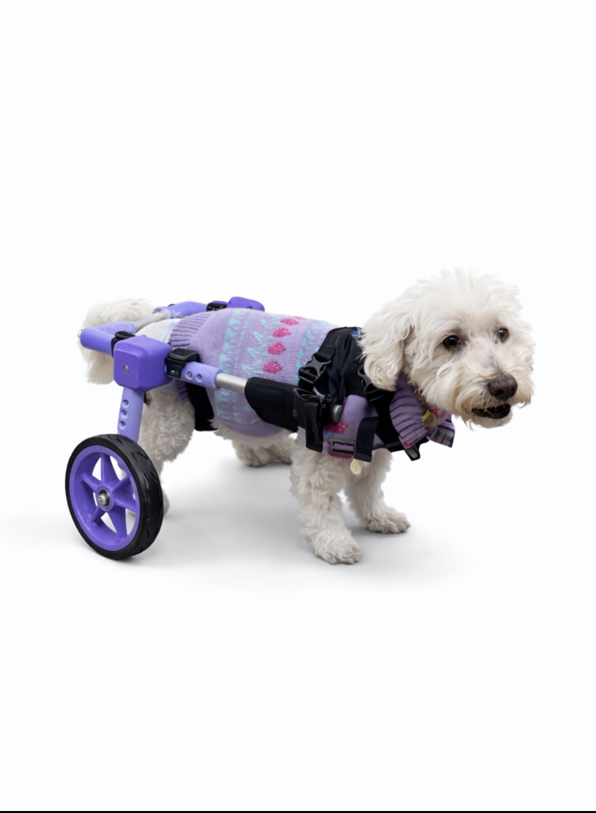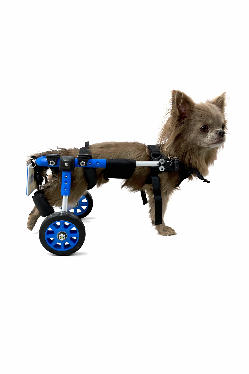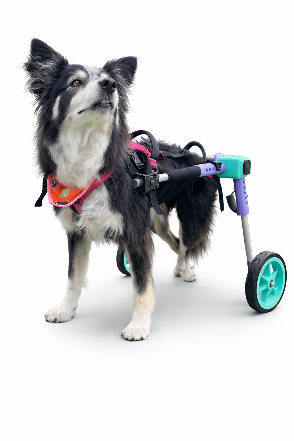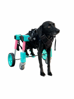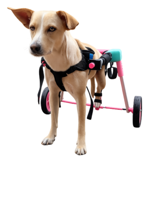 Silla de ruedas fabricada a la medida mediante tecnología 3D y estructura en aluminio, lo que garantiza un producto liviano y cómodo. Su diseño totalmente regulable permite ajustar la altura y el largo de acuerdo con la anatomía de cada mascota, brindando mayor estabilidad, seguridad y confort durante su uso, favoreciendo así su movilidad y calidad de vida.